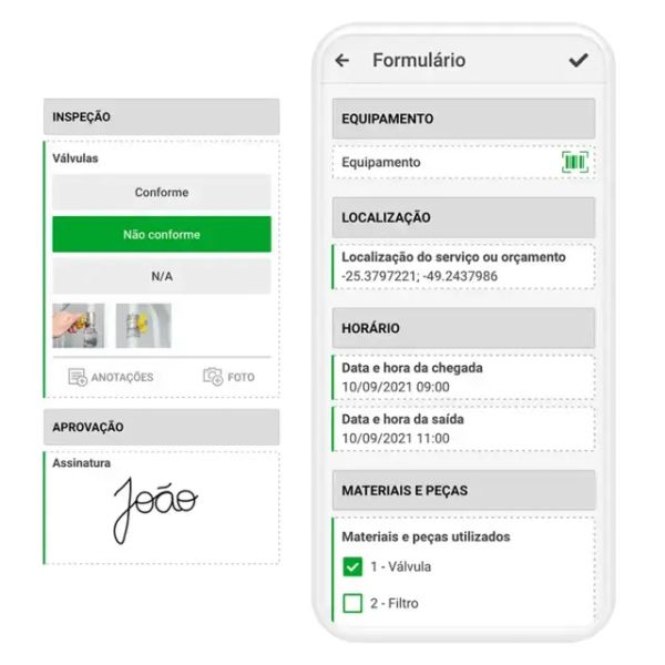 O técnico recebe a demanda no aplicativo e inicia o preenchimento do formulário ou checklist com vários recursos: fotos, localização, assinatura digital, questão de conformidade, comando por voz, preenchimento automático e outros.