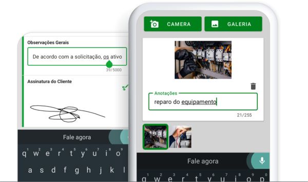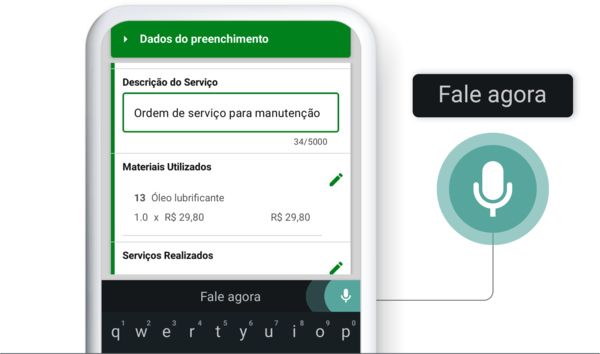 Em campos de textos é possível utilizar o preenchimento por comando de voz. No lugar de digitar, o técnico precisa apenas falar que o sistema transcreve o conteúdo.