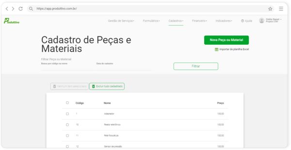 No sistema de ordem de serviço do Produtivo o cálculo de peças, materiais e serviços é feito de forma automática com base nos dados cadastrados. Faça orçamentos em instantes.