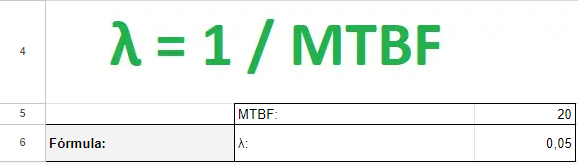 Para descobrir a taxa de falhas de um equipamento, basta dividir 1 pelo MTBF. Pegando o exemplo anterior: λ = 1 / 6,8333 = 0,1463.
