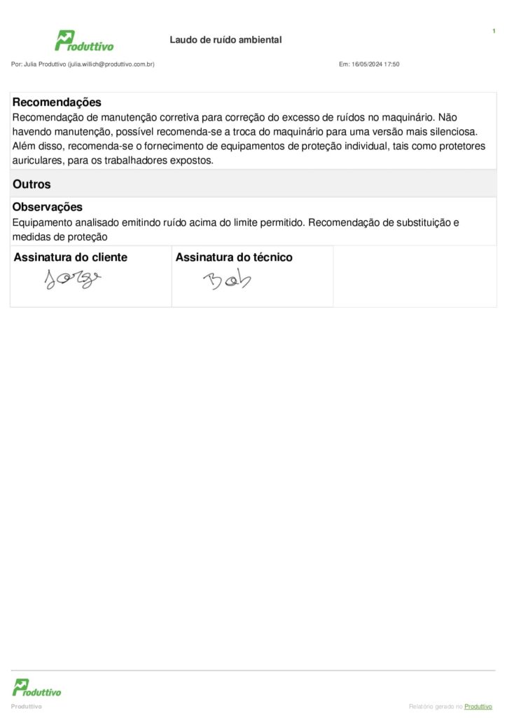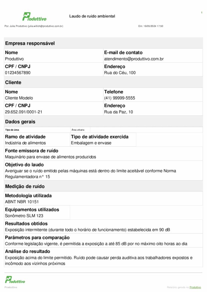 O Produttivo conta com um modelo de laudo de ruído ambiental pronto para usar. Veja como ele fica preenchido e exportado em PDF: