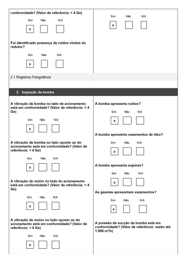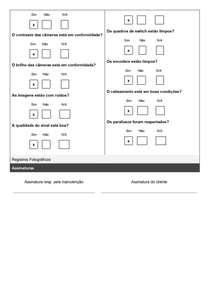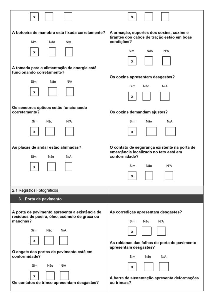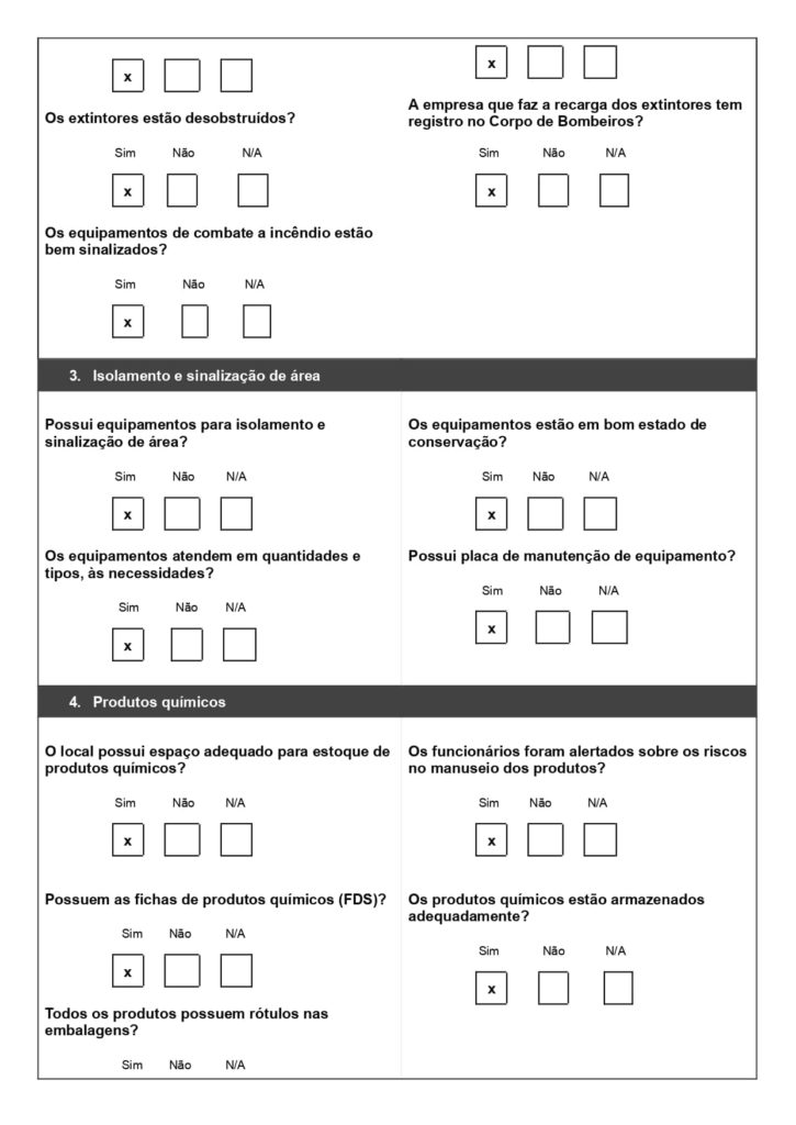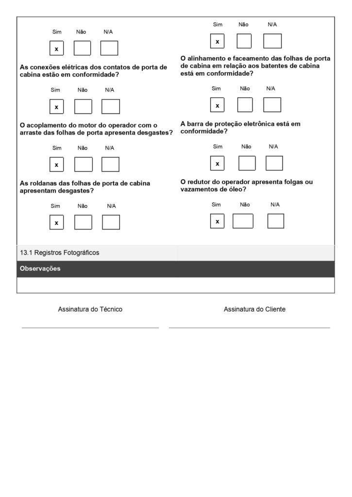 No modelo acima, usado para combate a incêndio, o técnico marca se cada item do extintor ou porta corta-fogo está conforme ou não. Isso garante padronização na checagem e evita esquecimentos de etapas importantes.