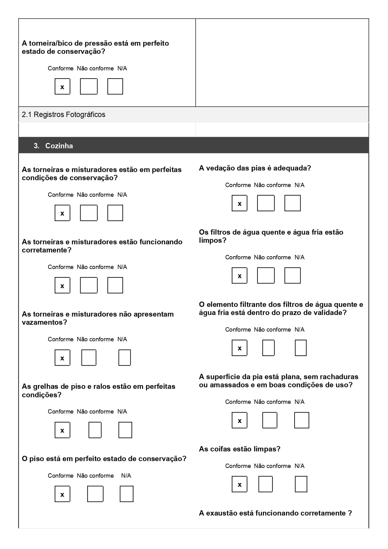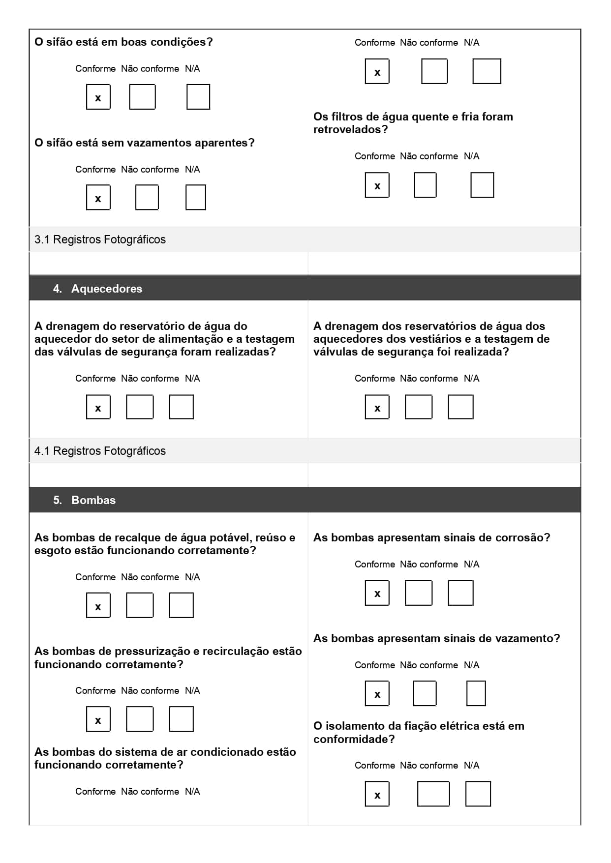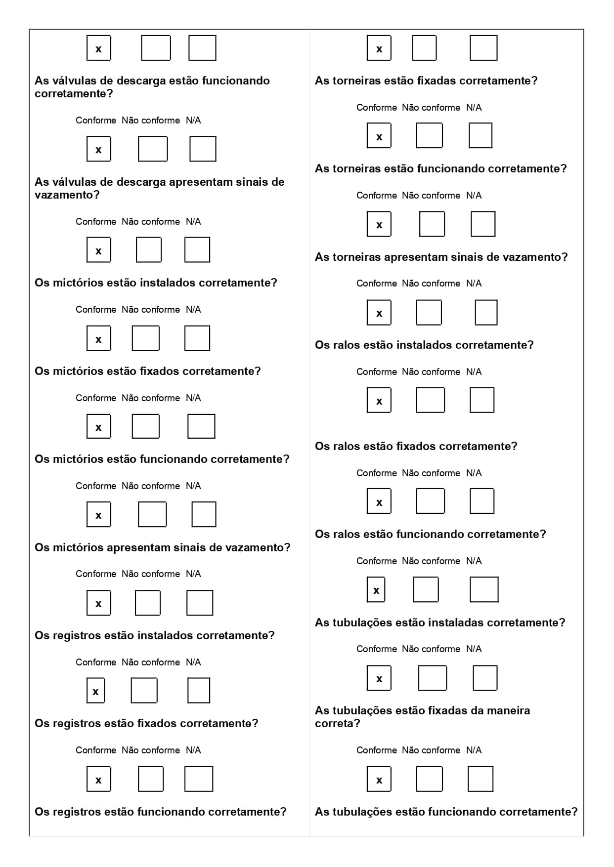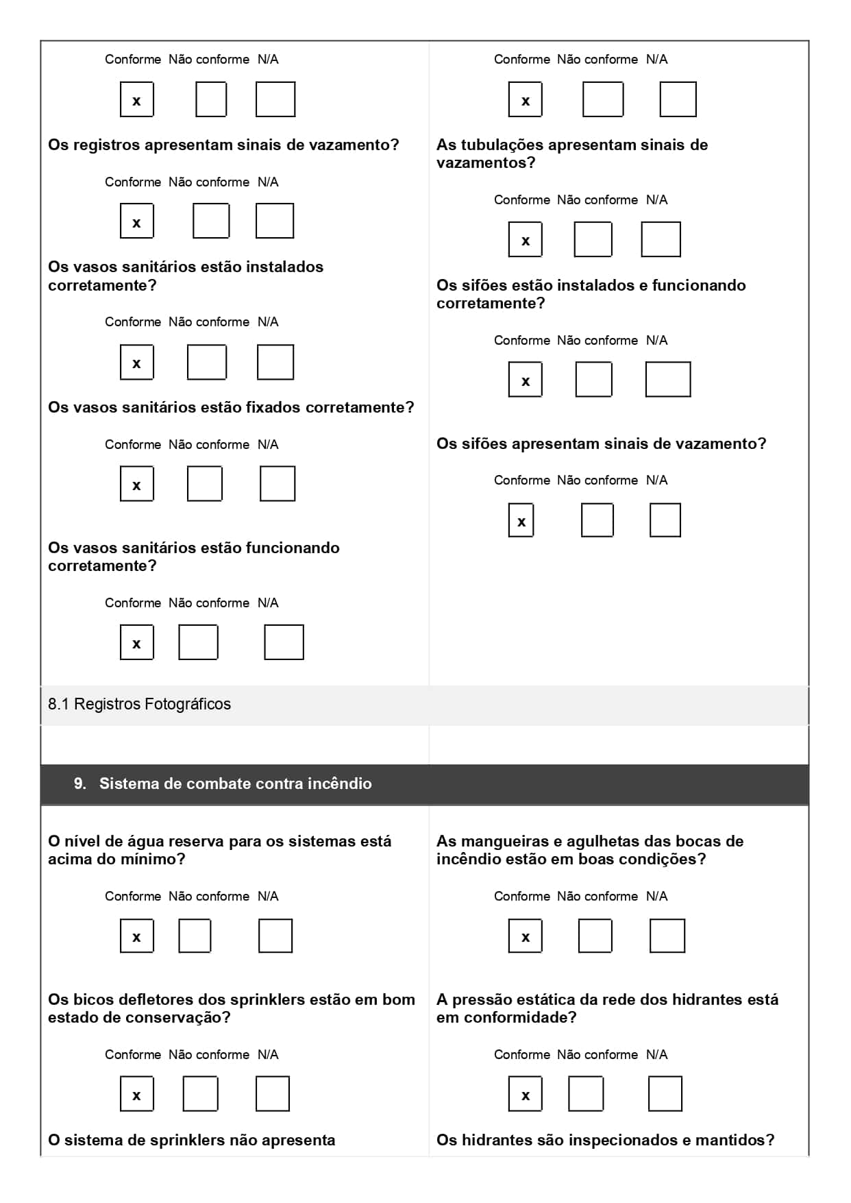No modelo acima, usado para combate a incêndio, o técnico marca se cada item do extintor ou porta corta-fogo está conforme ou não. Isso garante padronização na checagem e evita esquecimentos de etapas importantes.