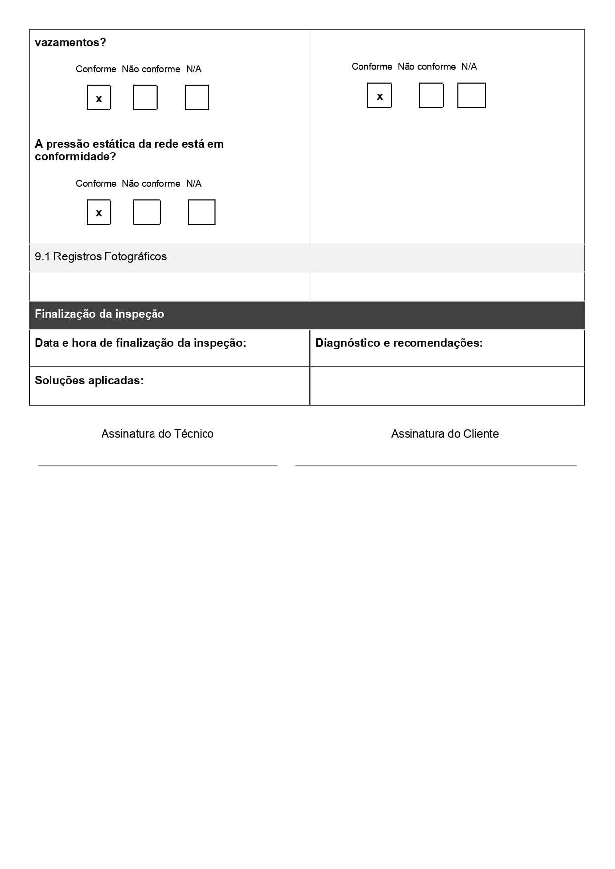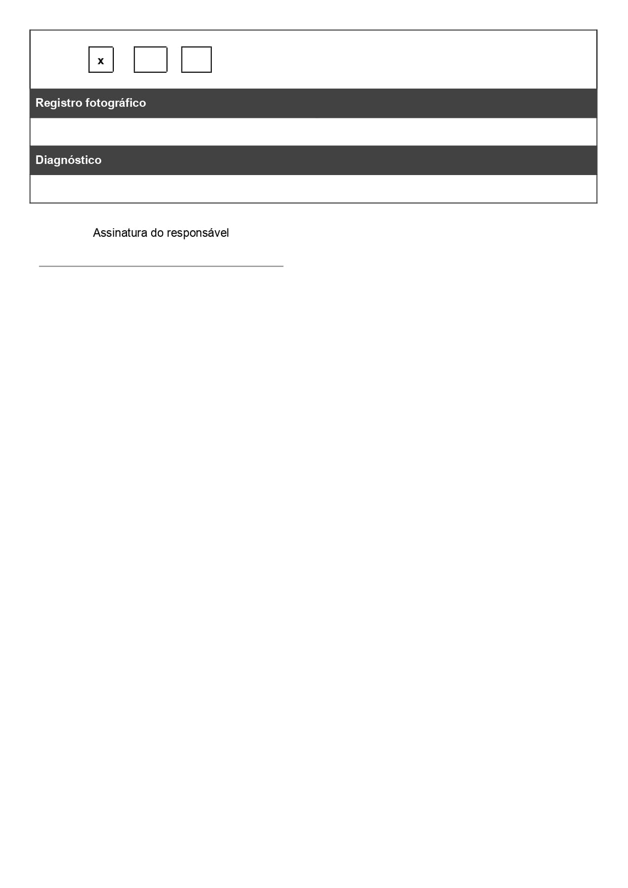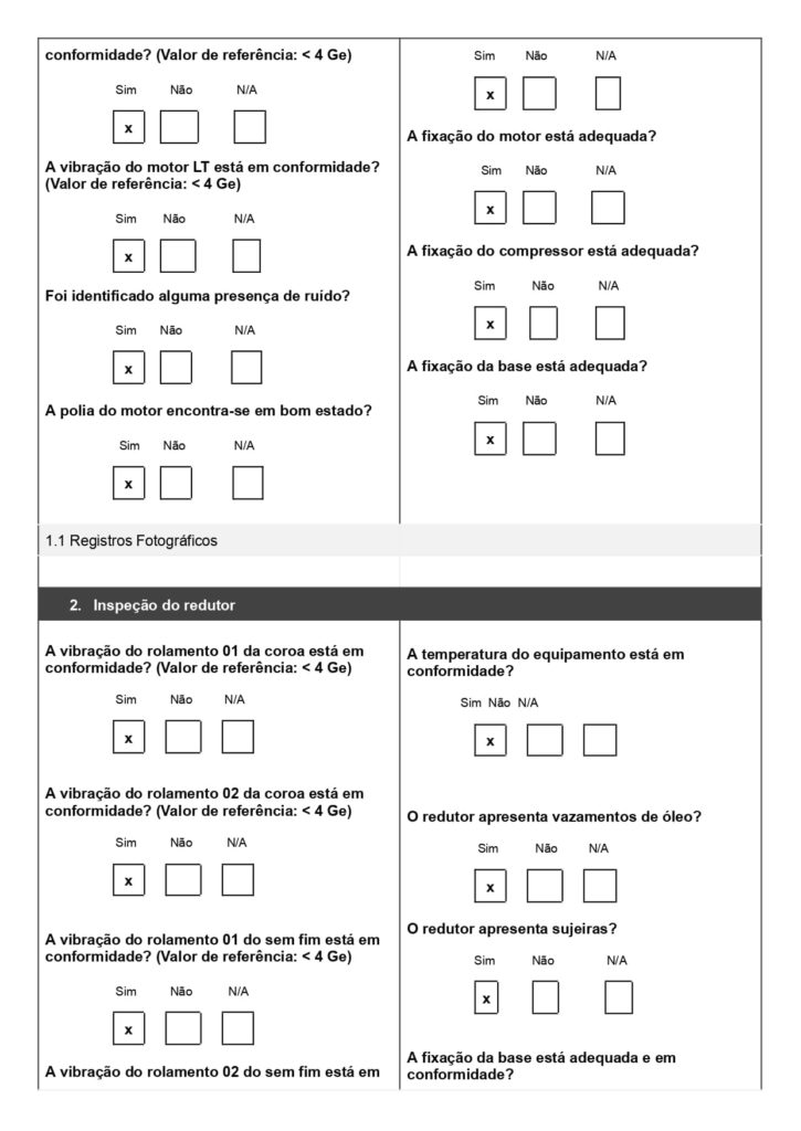 - Seção para identificação do equipamento e do responsável pela inspeção ou serviço;