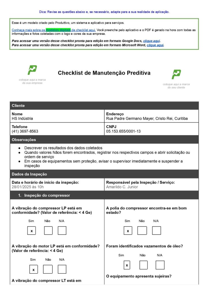 O modelo de checklist de manutenção preditiva é ideal para equipamentos caros e críticos, que precisam de acompanhamento constante por sensores ou monitores e assim é possível identificar possíveis falhas com antecedência.
