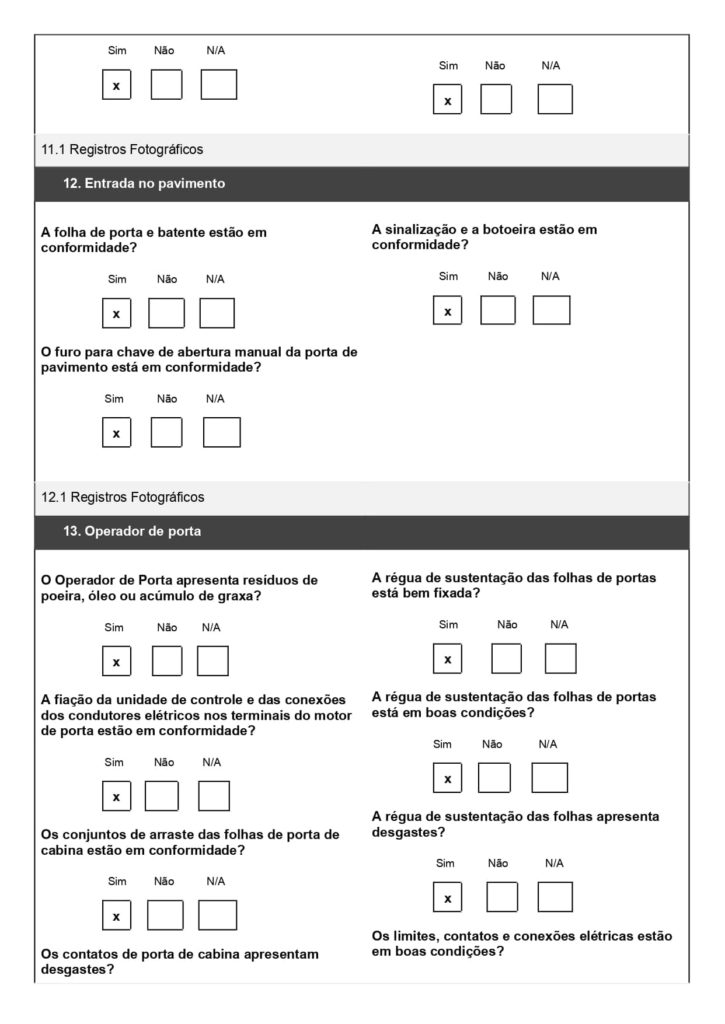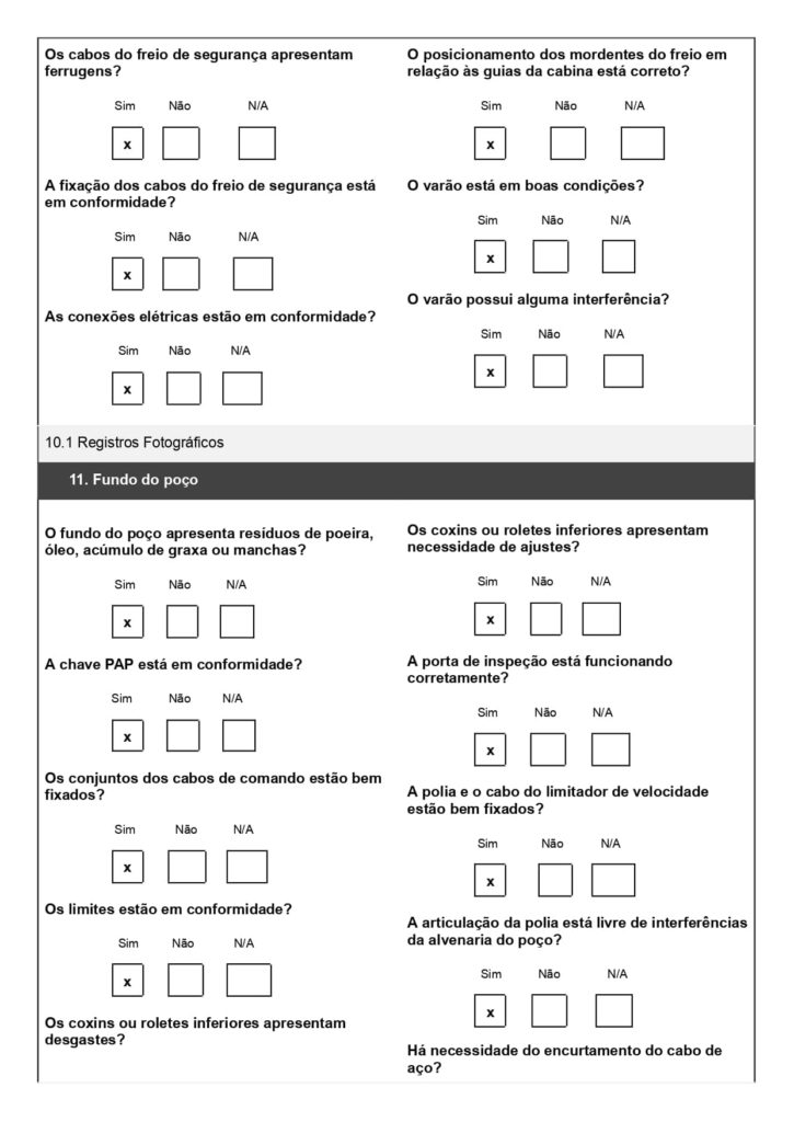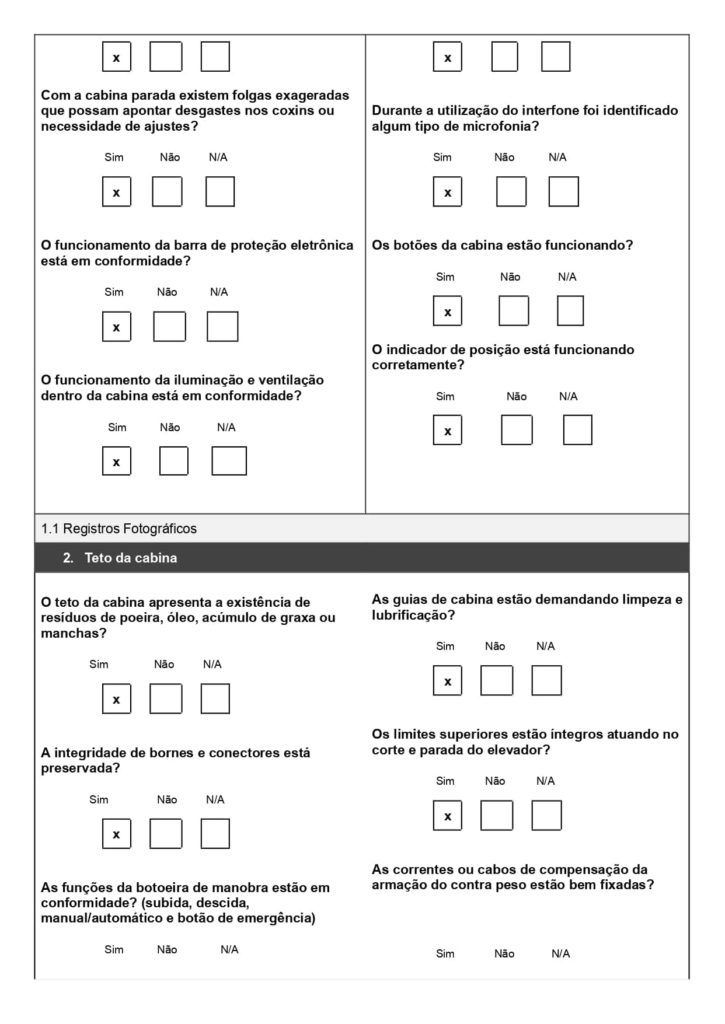 O checklist de elevadores ajuda na verificação dos componentes, com campos para inspeção da cabina, portas, quadro geral, sistema de segurança e outras partes que asseguram o bom funcionamento do elevador.