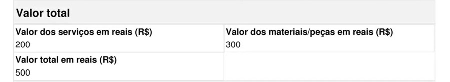 Essa é a quantia a ser paga pelo cliente, levando em consideração o trabalho do técnico, custos com deslocamento, peças utilizadas, entre outros gastos. Portanto, deve ser o preço total daquele serviço. Caso haja mais de um serviço para executar, coloque o preço de cada um deles separadamente e também o valor total a ser cobrado.