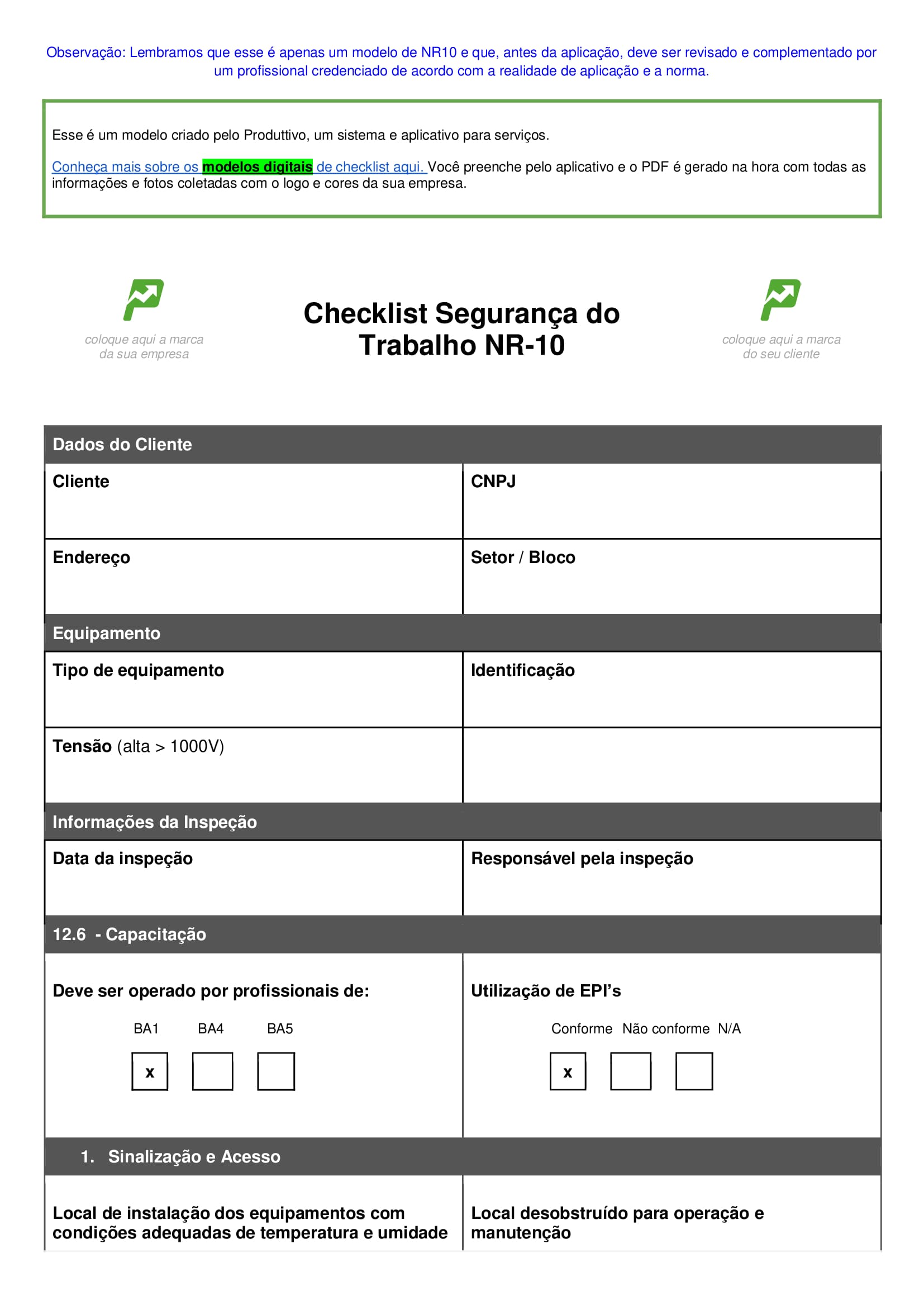 Já o trabalho com instalações elétricas exige um checklist específico, como esse modelo gratuito de Checklist NR-10. Ele faz parte do Kit Checklist e já vem pronto para usar, dá uma olhada: