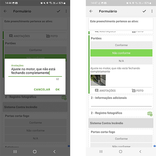 O sistema possui uma funcionalidade de plano de ação em caso de não conformidades encontradas em inspeções e manutenções. Veja como funciona: